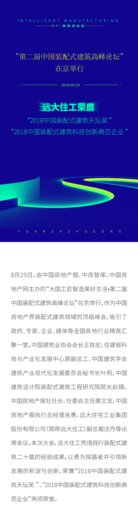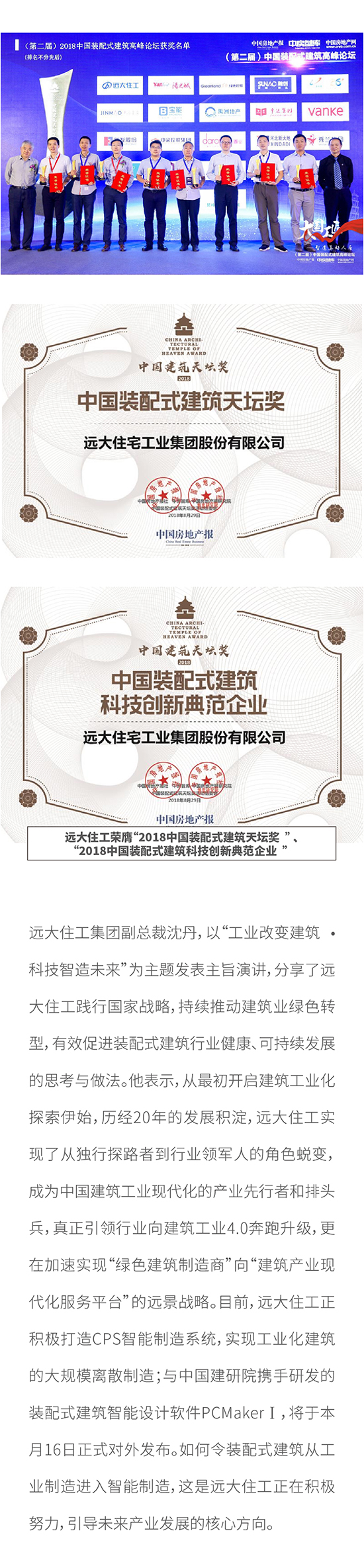 遠大住工榮膺 “2018中國裝配式建筑天壇獎 ” 、“2018中國裝配式建筑科技創新典范企業 ”